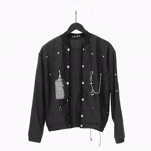 Nylon bomber with gold and silver-tone metal accessories (partly detachable). Features rib-knit stand collar, elasticated cuffs and press stud closure at the front. Made of three layers, fully lined. One-off piece.