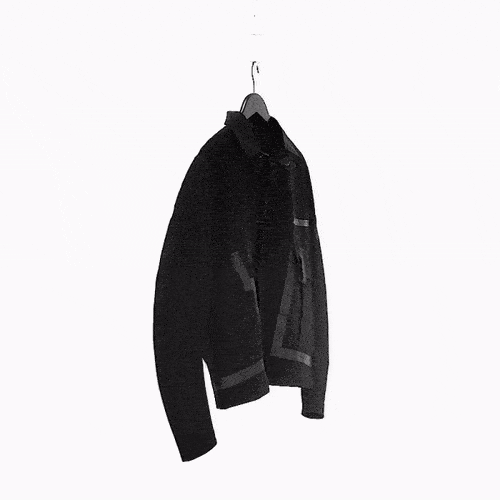 Lightweight jacket with spread collar and concealed zip closure with press-stud placket front. Features two large flap pockets with taped seams and tonal vinyl print details on left sleeve and rear. Curved sleeves provide a unique fit. In tone hardware. Webbing straps at interior. Fully lined. Unique item.